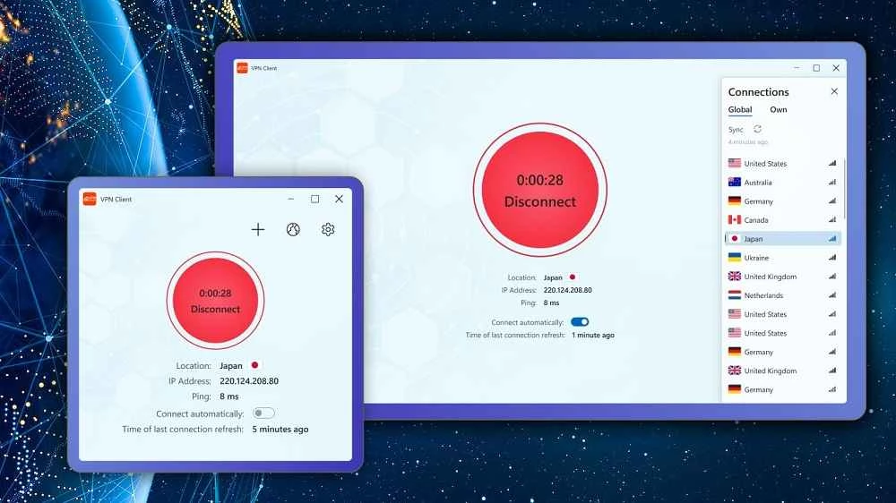 Ta innowacyjna aplikacja to najlepsze rozwiązanie dla użytkowników, którzy chcą anonimowo przeglądać sieć i ukryć swoją prawdziwą tożsamość. Klient VPN pozwala użytkownikom wybrać żądany serwer lub skorzystać z domyślnego automatycznego wyboru.