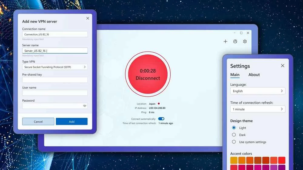 Klient VPN dla systemu Windows to potężne narzędzie zapewniające bezpieczeństwo i ochronę komputera z systemem Windows. Usprawnia ruch internetowy, oferując dedykowane serwery. To proste, szybkie i lekkie narzędzie, które pomaga odblokować zablokowane witryny i uniknąć cenzury internetu.